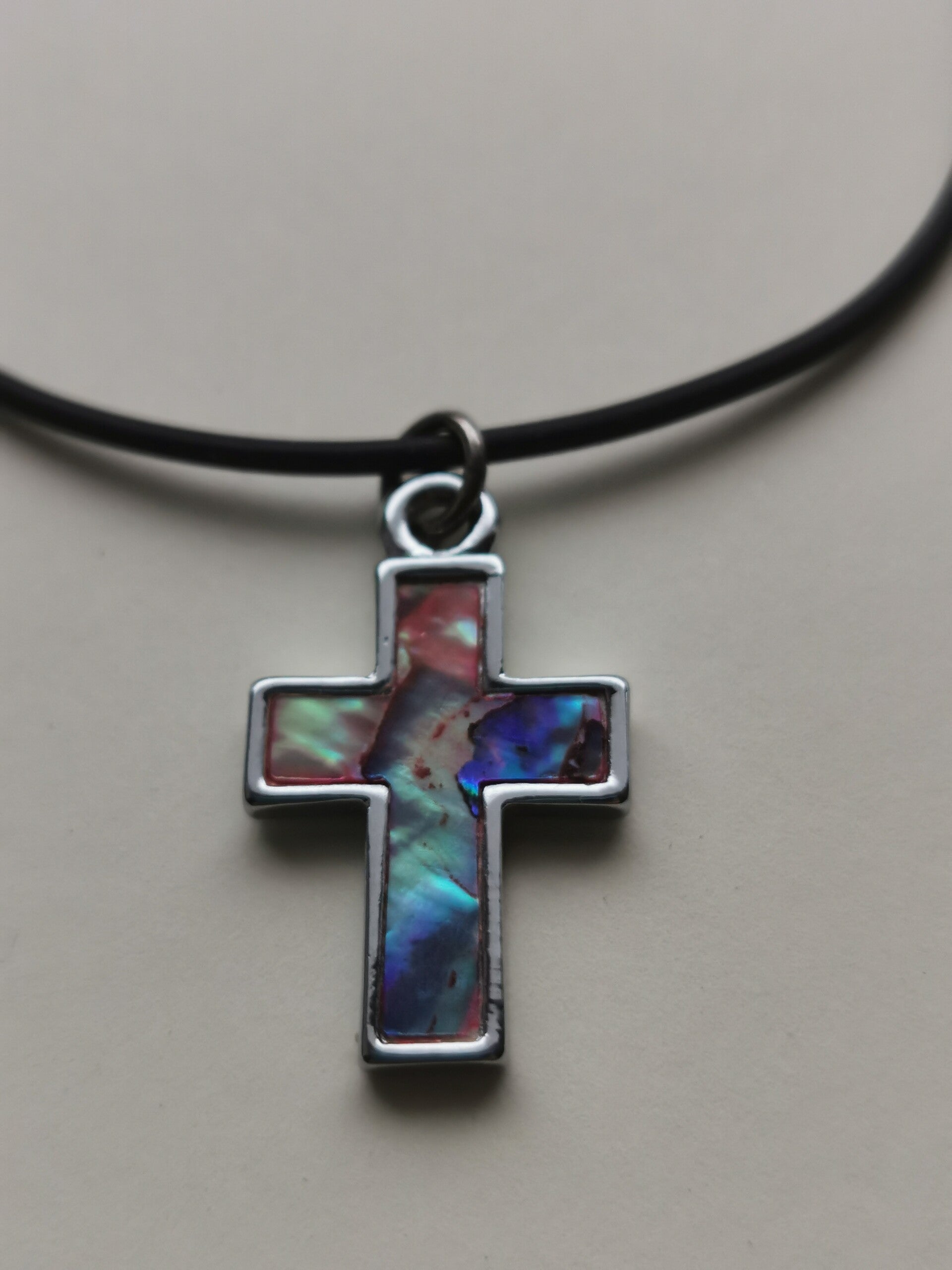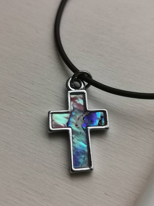 Verzilverd kruisje met Paua schelp. Fonkelende kleuren, die veranderen afhankelijk van hoe het licht erop valt (zie ook de foto's). Wordt geleverd met koord.