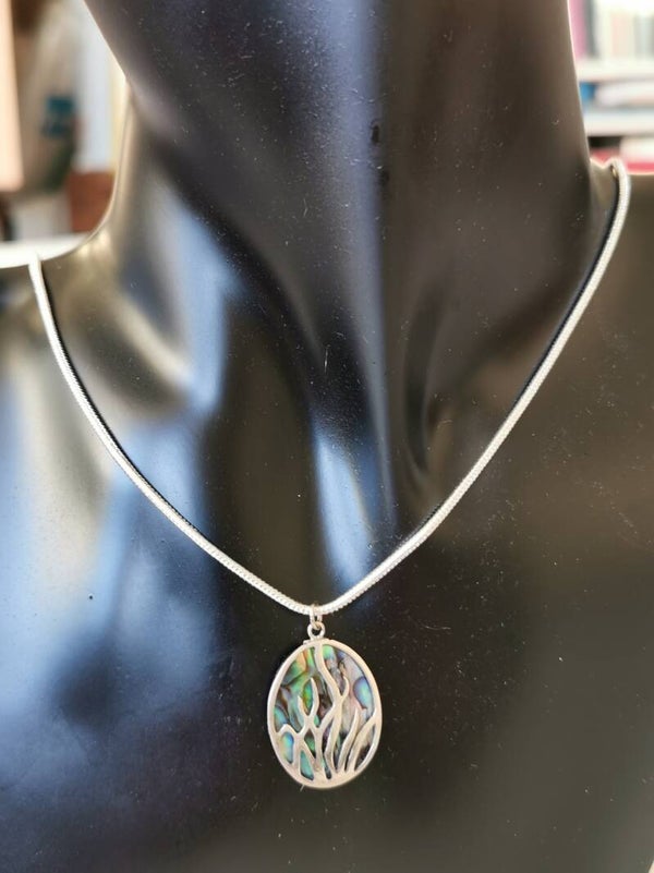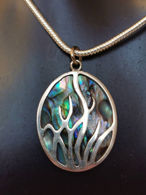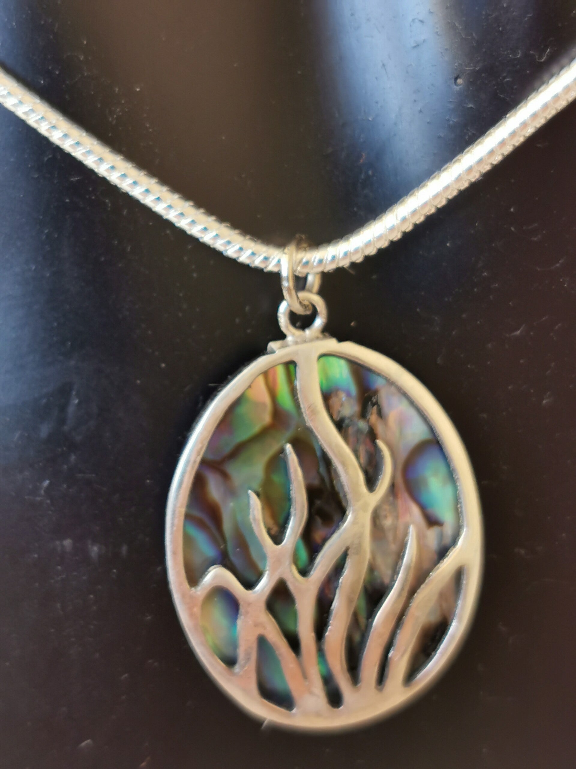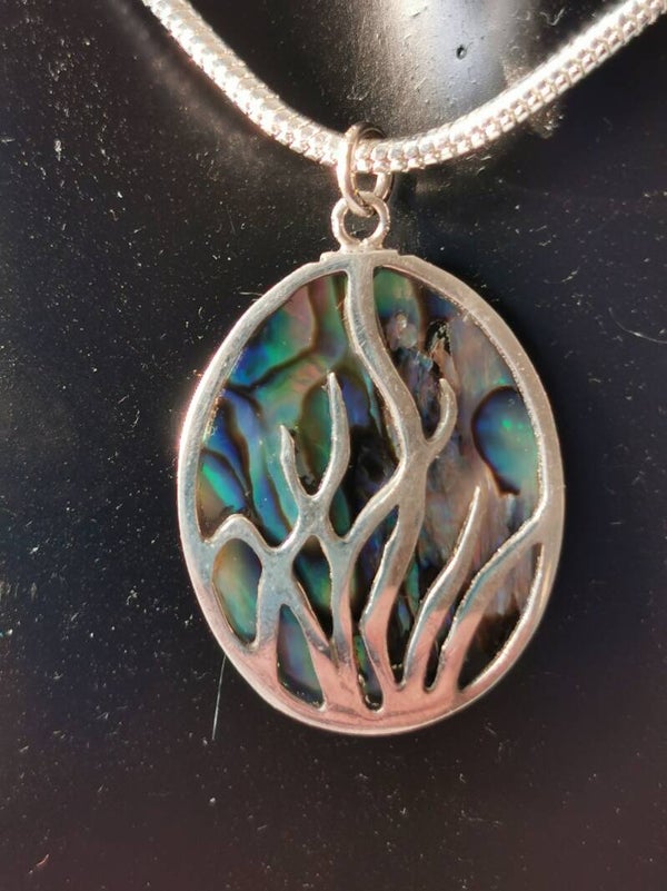 Handgemaakte zilveren hanger met Paua schelp. De schelp heeft fonkelende regenboogkleuren en is afgewerkt met sierlijke takjes.