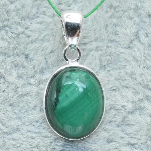 Kleine, ovale Malachiet gezet in 925 zilver. De hanger is aan de achterzijde gesloten.