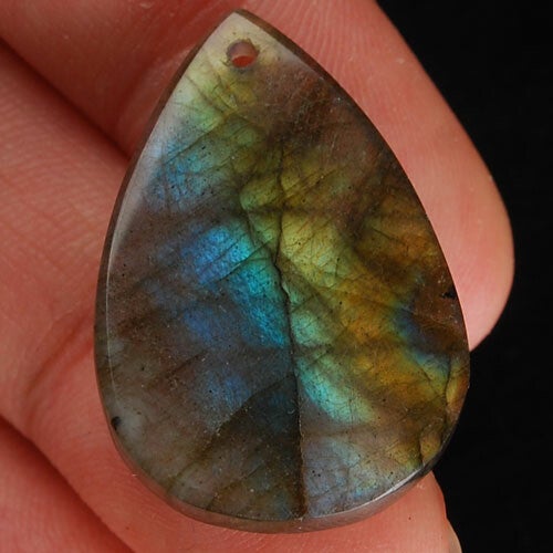 Druppelvormige Labradoriet cabochon. Mooie flash kleuren.Wordt geleverd met verzilverd aanhaakoog.