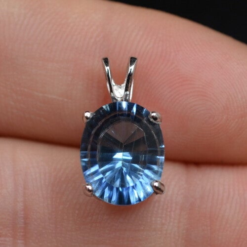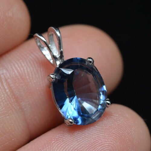 Stijlvolle zilveren hanger met een sprankelende Blauwe Topaas. De ovale steen is helderblauw van kleur en facet geslepen. Prachtige kwaliteit. Gesplitst hangeroog, prongsetting.