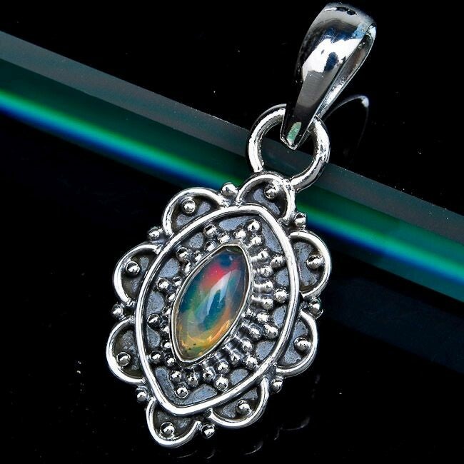 Mooi vormgegeven zilveren hanger met een Ethiopische Edelopaal. Veelkleurige steen van bijzondere kwaliteit. Het zilver heeft een antique finish afwerking.