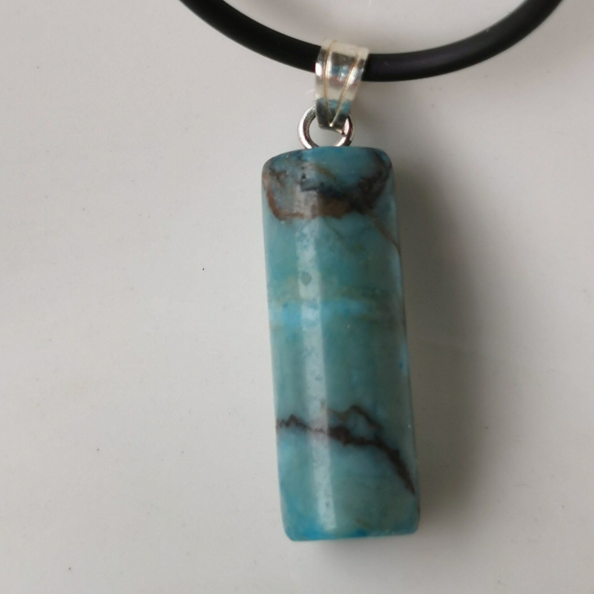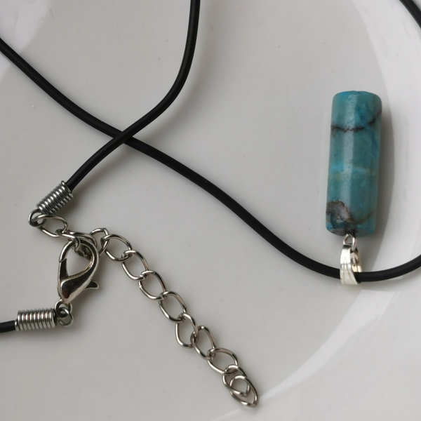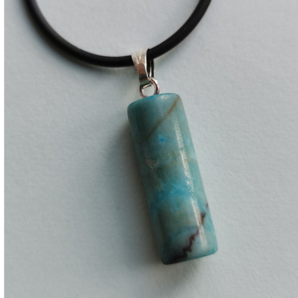 Cilindervormig hangertje van blauwe Agaat. Het hangeroog is verzilverd. Wordt geleverd inclusief zwart vegan koord met verlengkettinkje.