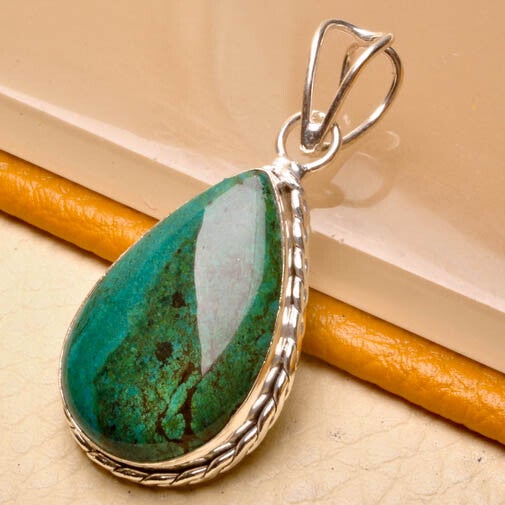 Chrysocolla van hoge kwaliteit met mooie blauwgroene tinten. De steen is glanzend gepolijst en gezet in een massief zilveren, bewerkte rand. Kan aan ketting maar vanwege het grote oog ook stoer aan een koord. Handgemaakt.