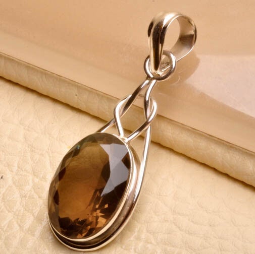 Elegante hanger met Rookkwarts, gezet in zilver. De steen is zowel aan de voor- als aan de achterzijde facet geslepen, wat een sprankelend effect geeft. Handgemaakt sieraad met een speelse en strakke vormgeving. De achterzijde is open.