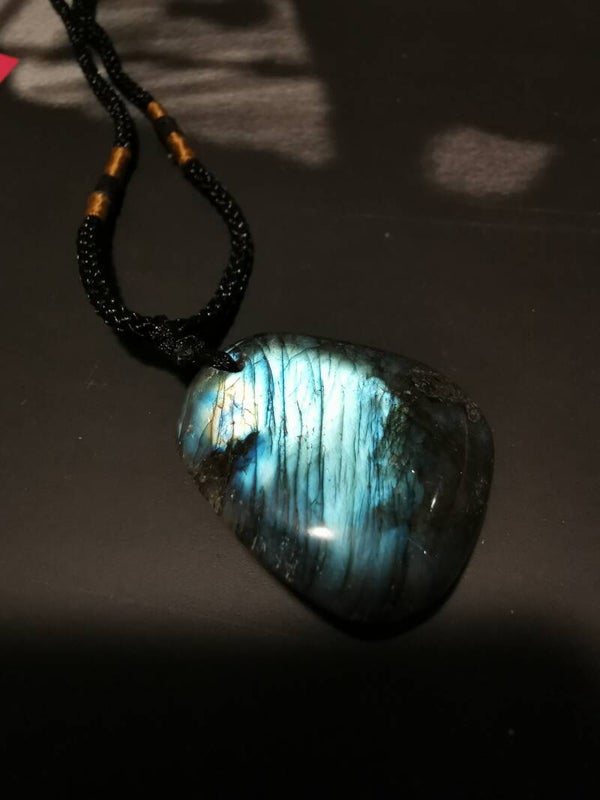 Labradoriet met een vurige blauwe gloed. Het gevlochten koord is zwart met goudbruine afwerking. De lengte van het koord is aan te passen.