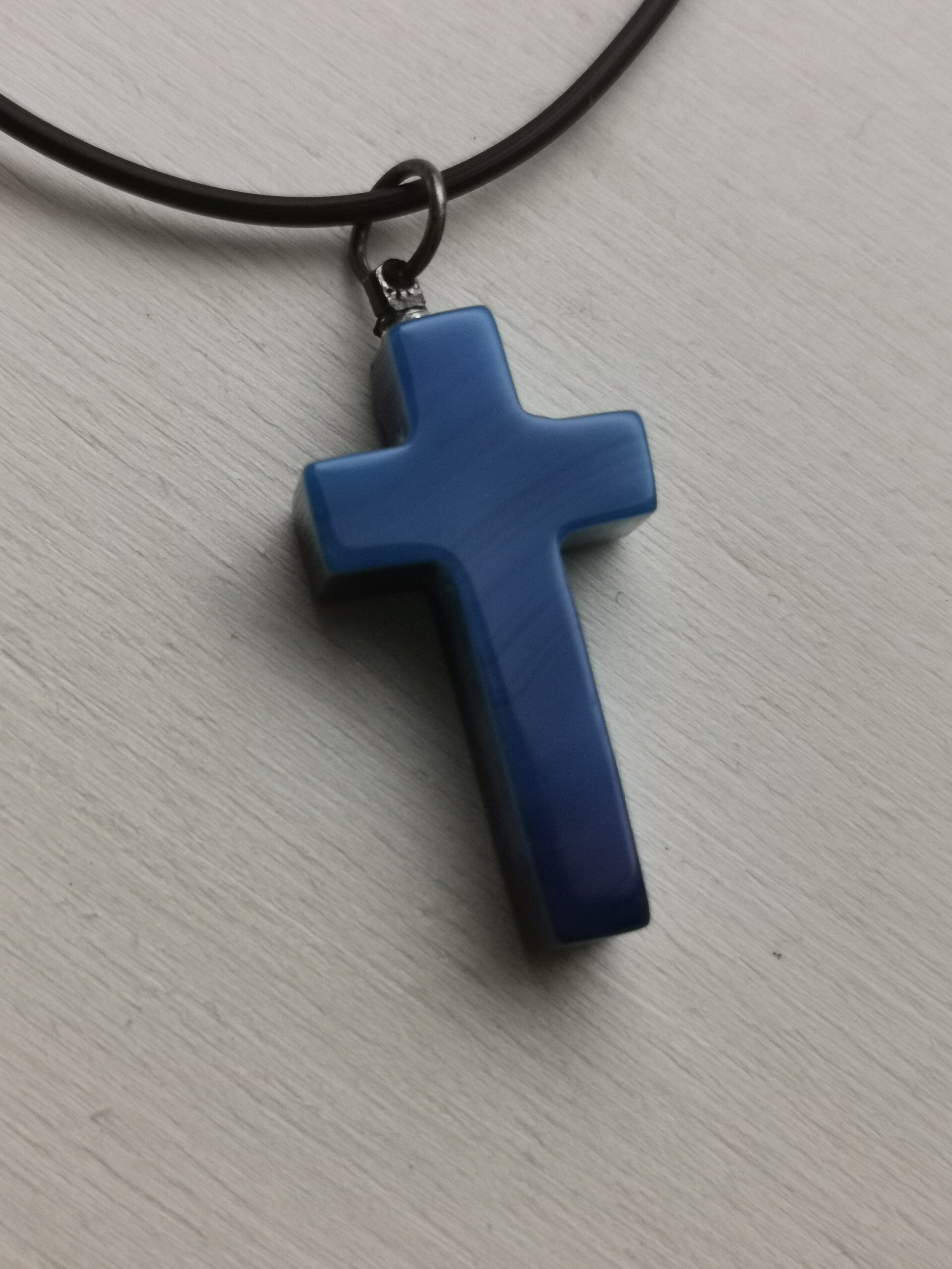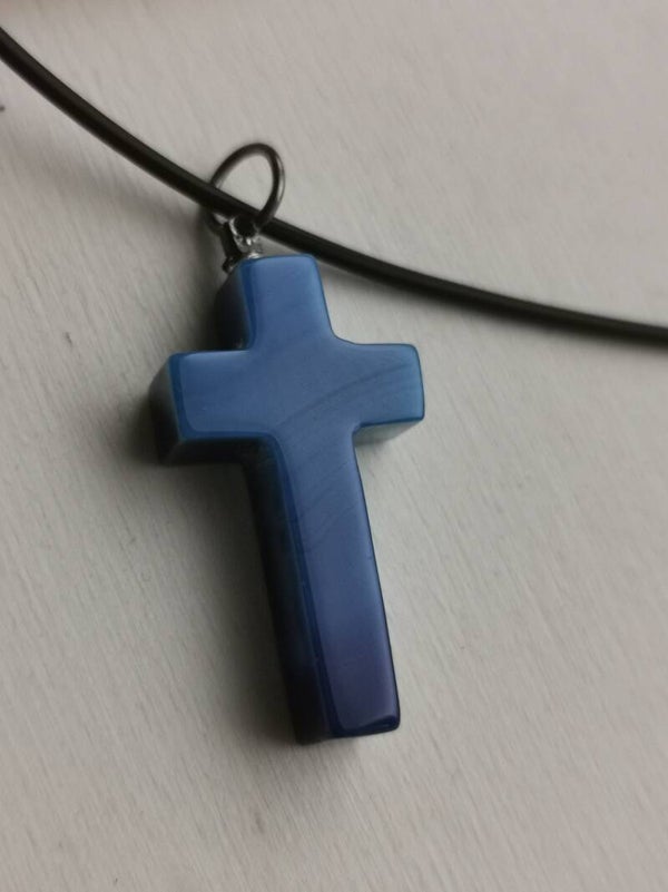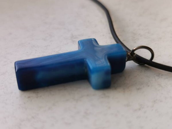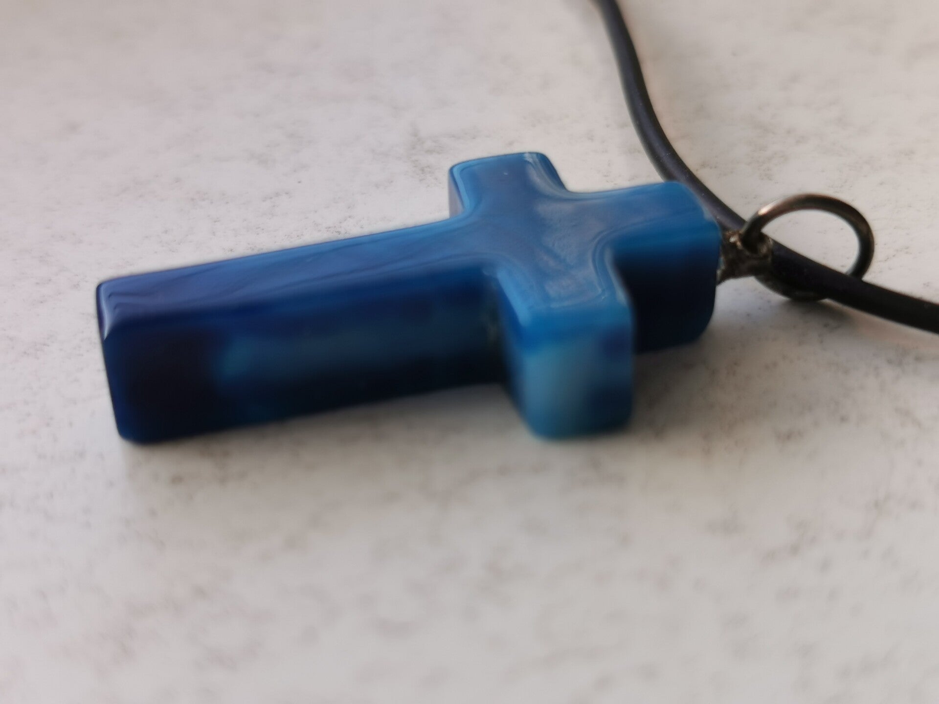 Mooie stoer kruis, gemaakt van Agaat. De blauwe tint verloopt van licht naar donker. De steen is gekleurd, maar de belijning van de natuurlijke steen is zichtbaar. Inclusief vegan koord.