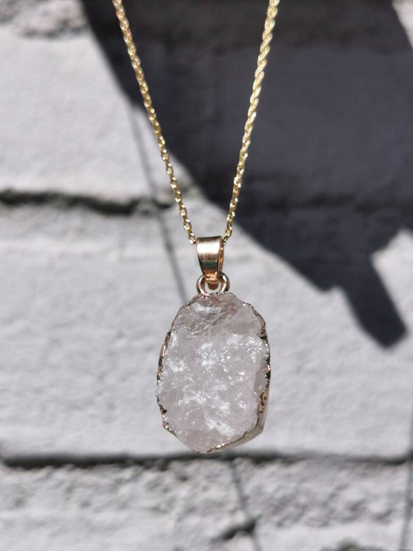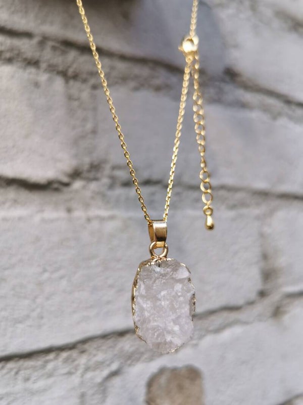 Ruwe witte kwartskristal met goud vergulde afwerking. Inclusief vergulde ketting.