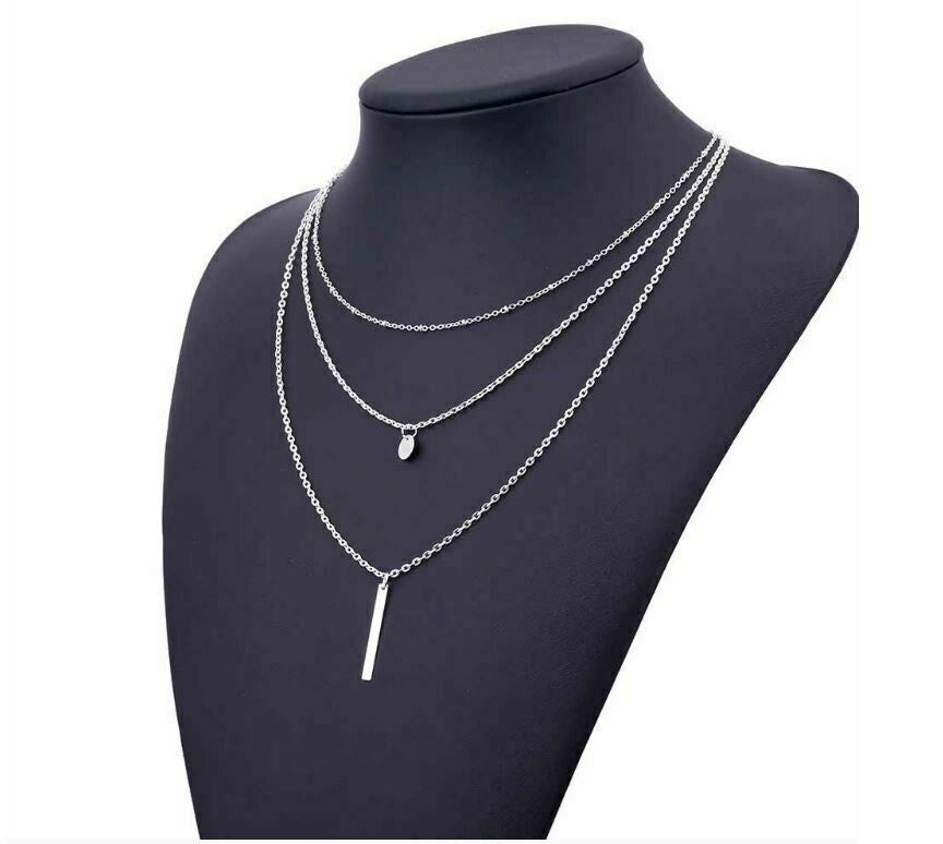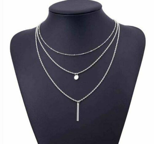 Driedelige verzilverde ketting, bestaande uit een choker met bolletjes, een ketting met een rond plaatje en een langere ketting met een staafje.