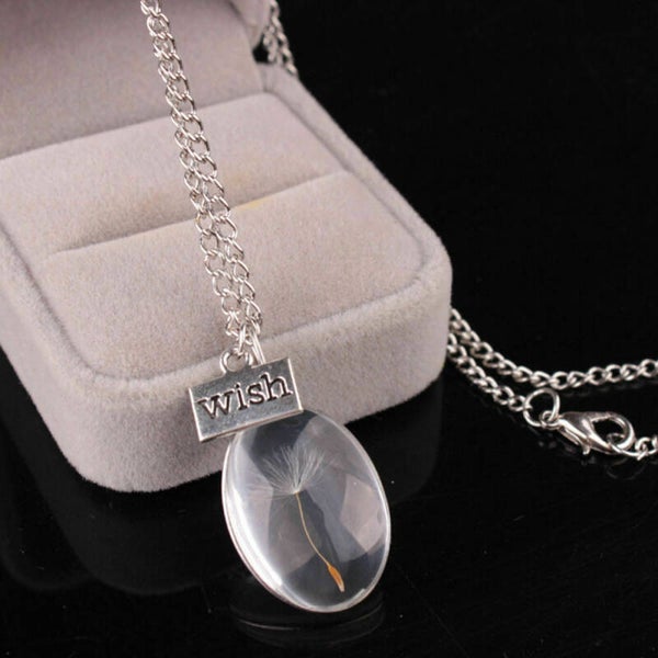 Ellipsvormige hanger van kristalglas met een echt zaadpluisje erin. Aan de hanger is ook een sierplaatje bevestigd. Wordt geleverd met verzilverde ketting. Make a wish and fingers crossed!