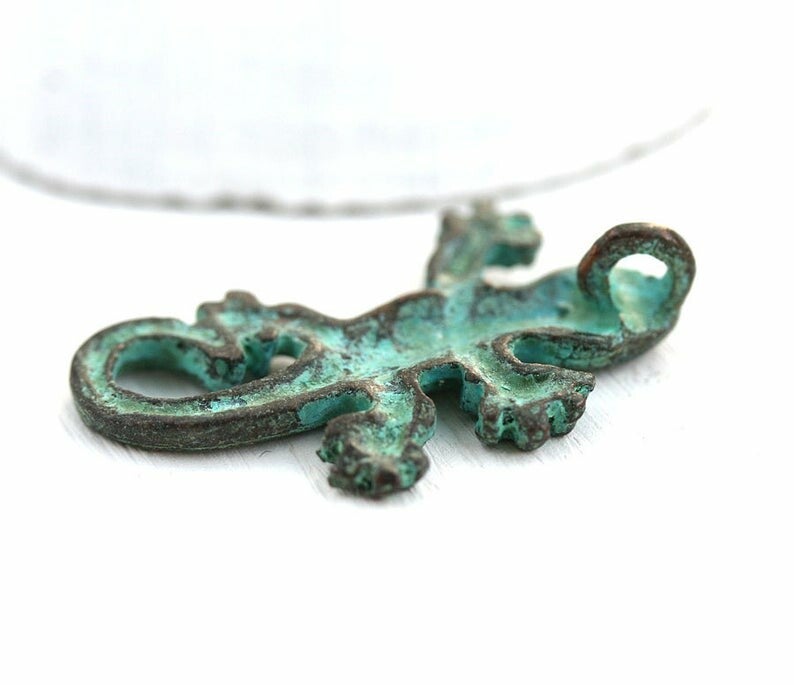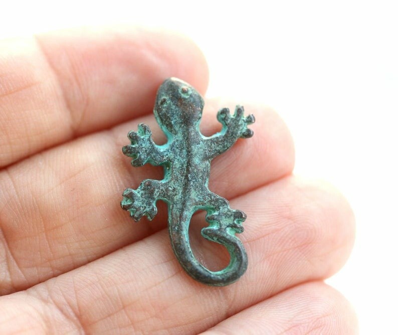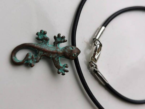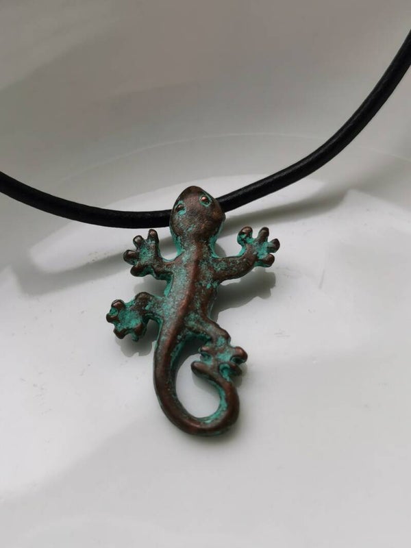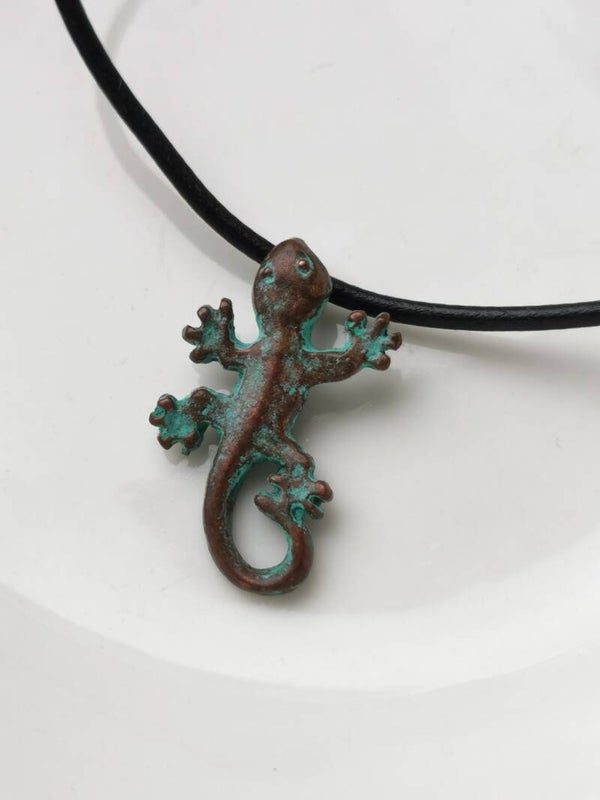 Opvallende choker met een antiek-koperen Gekko aan een vegan koord. Het beestje komt uit Griekenland en is daar met de hand gegoten. Vervolgens is er een mooie groene patina afwerklaag op aangebracht. Weer eens wat anders!