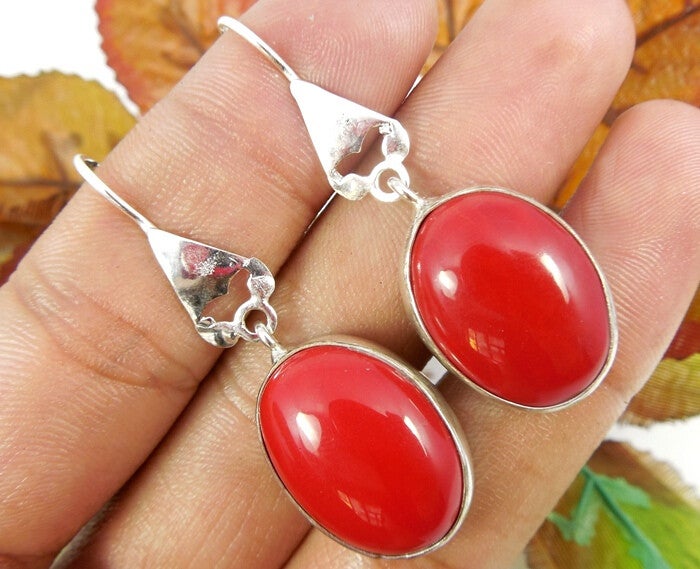 Verzilverde oorhangers met een opvallende ovale steen in een koraalrode kleur.