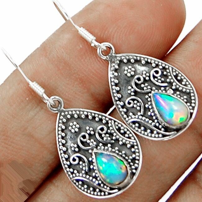 Deze prachtig bewerkte, handgemaakte oorhangers zijn van massief zilver met antique look. De schitterend gekleurde, echte Opalen komen uit Ethiopië en vallen extra op tegen de donkere achtergrond. Beauties!