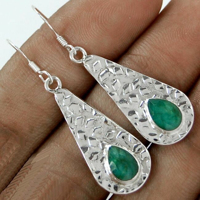 Prachtige groene Smaragden, gezet in massief zilveren oorhangers. De druppelvormige plaatjes zilver zijn zo bewerkt dat er een speels licht-donker effect ontstaat. Heel bijzonder en handgemaakt.
