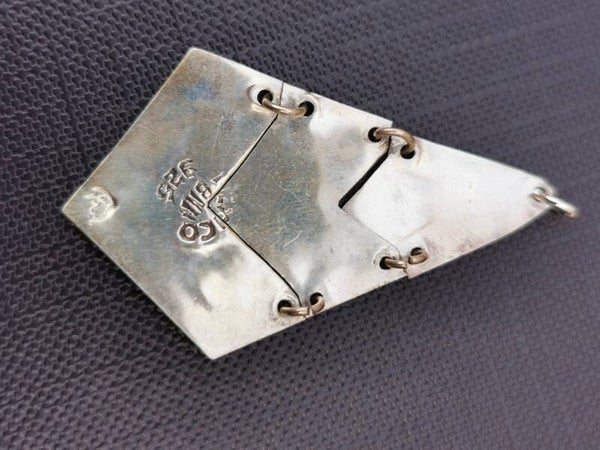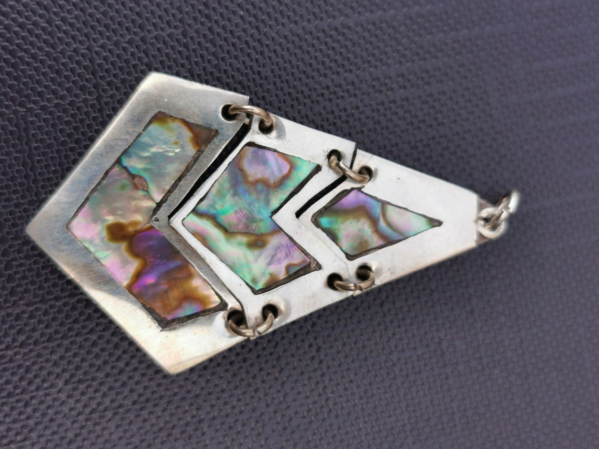 Mooie lichtgewicht hanger in ruitvorm. Gemaakt van 925 zilver en ingelegd met Abalone schelp in o.a. paarsachtige tinten. De hanger bestaat uit drie losse segmenten die met zilveren ringetjes aan elkaar zijn bevestigd. Handgemaakt in Mexico.