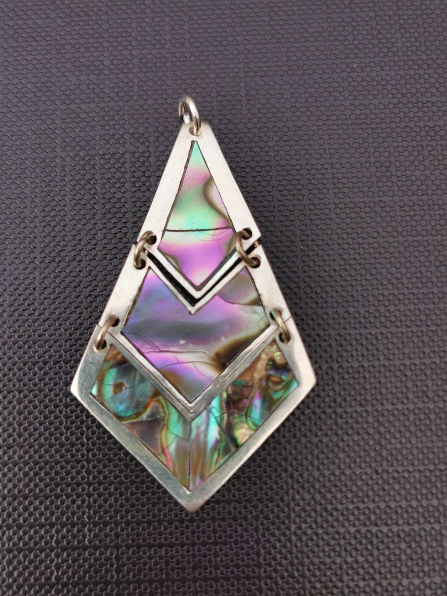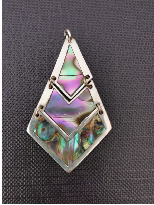 Mooie hanger in ruitvorm. Gemaakt van 925 zilver en ingelegd met Abalone schelp in o.a. paarsachtige tinten. De hanger bestaat uit drie losse segmenten die met zilveren ringetjes aan elkaar zijn bevestigd. Handgemaakt in Mexico.