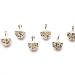 Speelse halfronde hanger met Dalmatiër Jaspis. De rand is met zilver afgewerkt. De hanger is aan beide zijden te dragen.