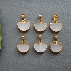 Speelse halfronde hanger met Witte Jade. De rand is met goud afgewerkt. De hanger is dubbelzijdig te dragen.