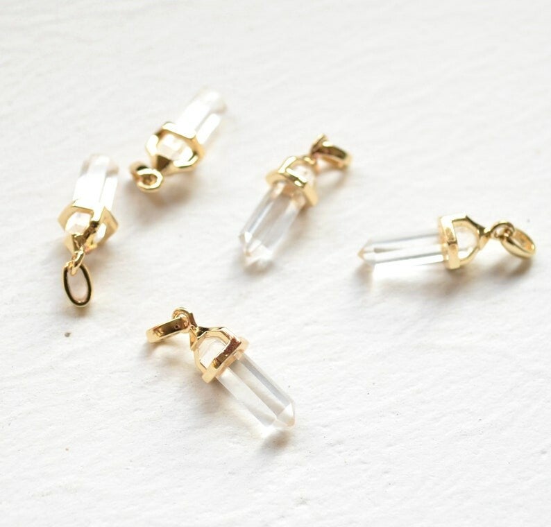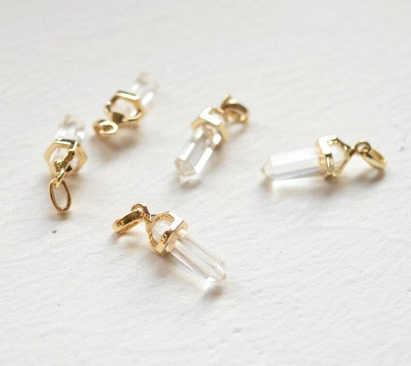 Mooie kleine zeskantige pendel van Bergkristal. Het is een dubbeleinder, oftewel de steen is aan beide uiteinden gepunt. Het kristal heeft een paar pluisachtige insluitingen, dit komt veel voor bij deze steensoort. De hanger is met goud afgewerkt en heeft een verguld oog.