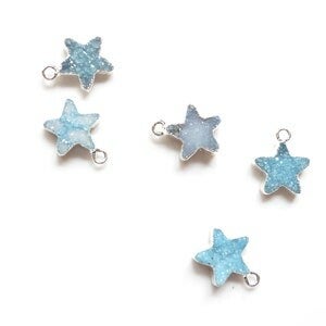 Sprankelend hemelsblauw hangertje van druzy kristal in de vorm van een ster. De rand is met zilver afgewerkt.