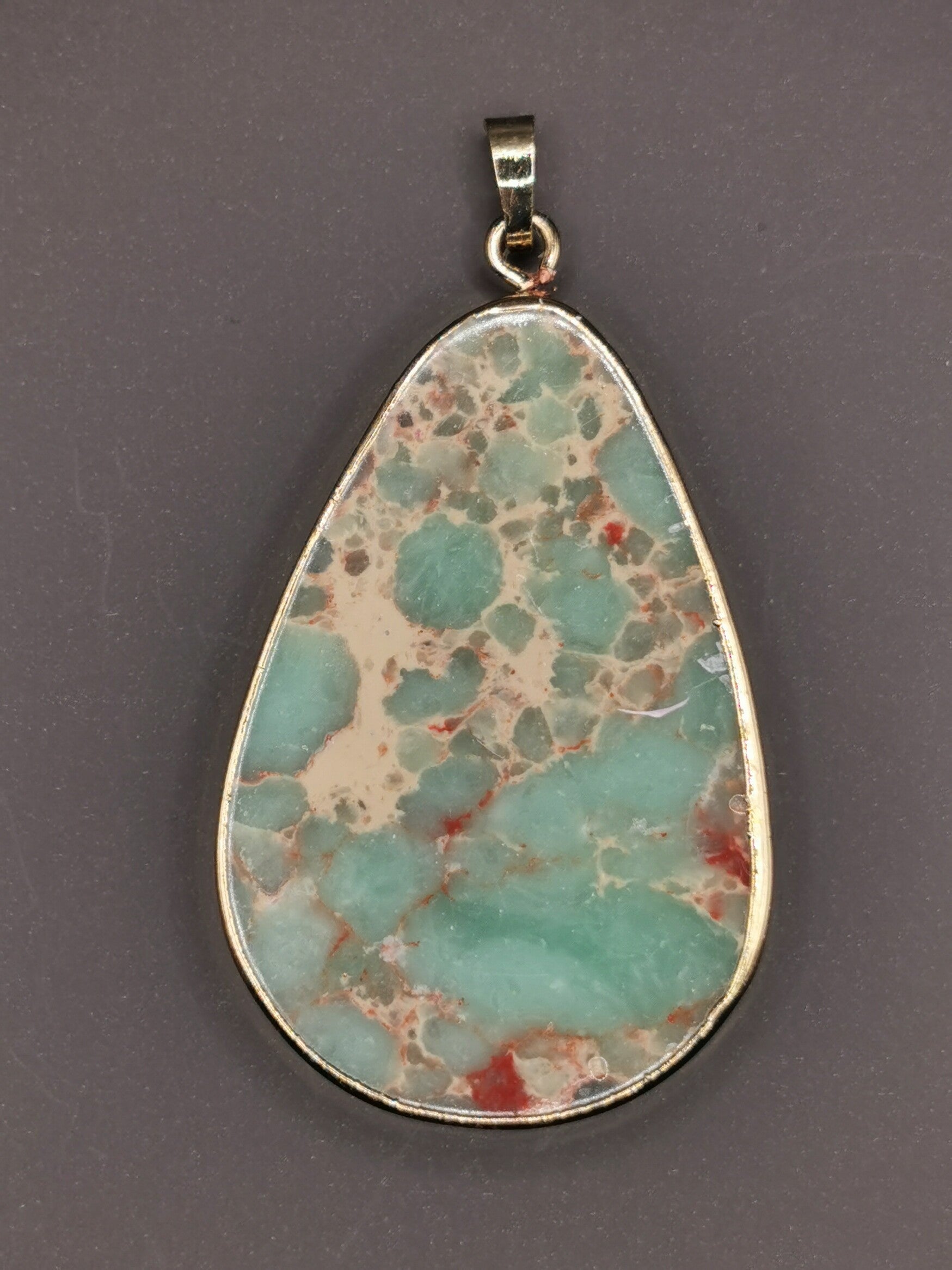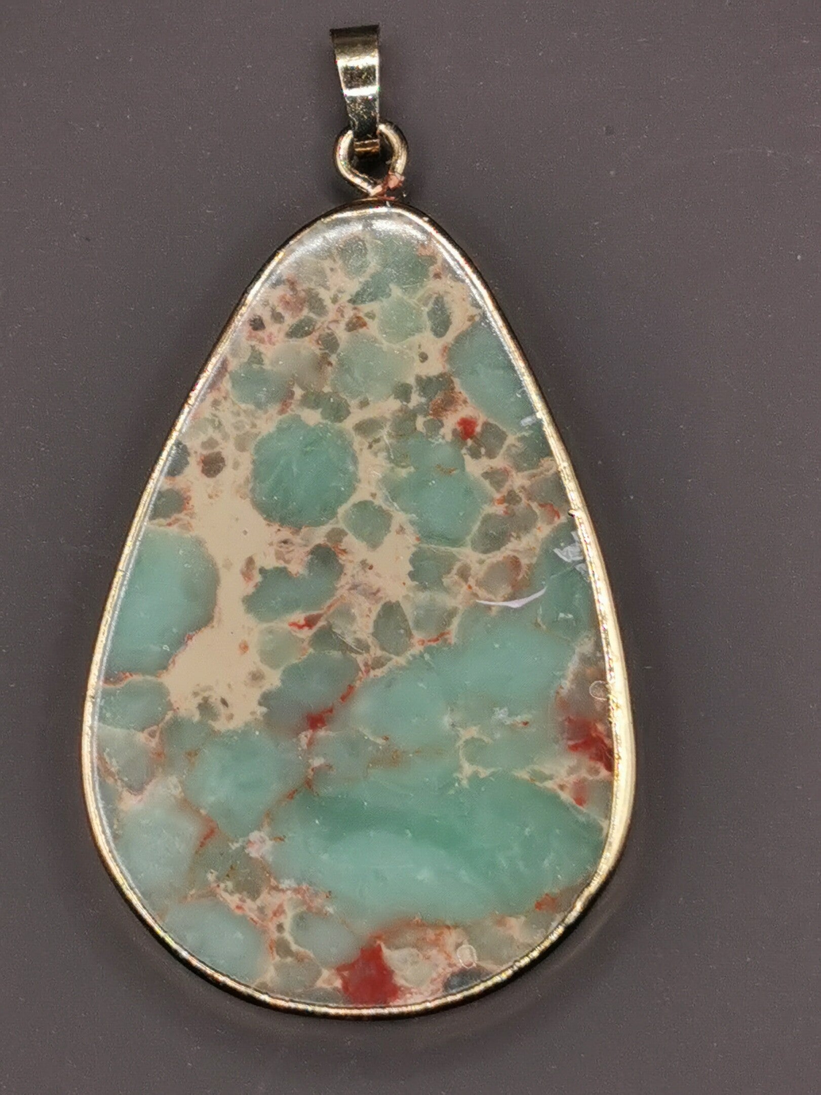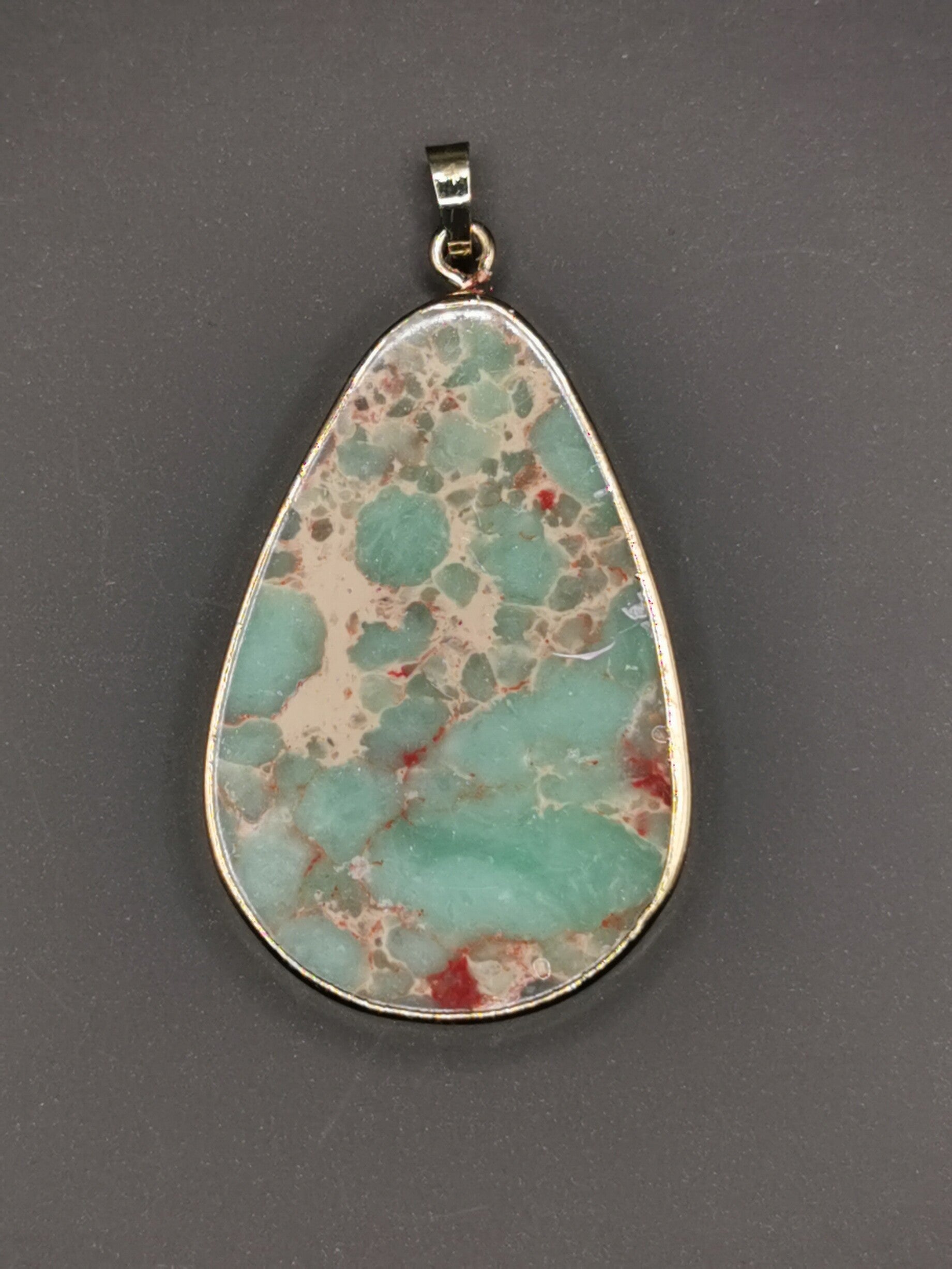 Opvallende hanger met een druppelvormige Jaspis in een zachte blauwgroene tint. De rand is goud verguld. De hanger is aan de achterzijde open.