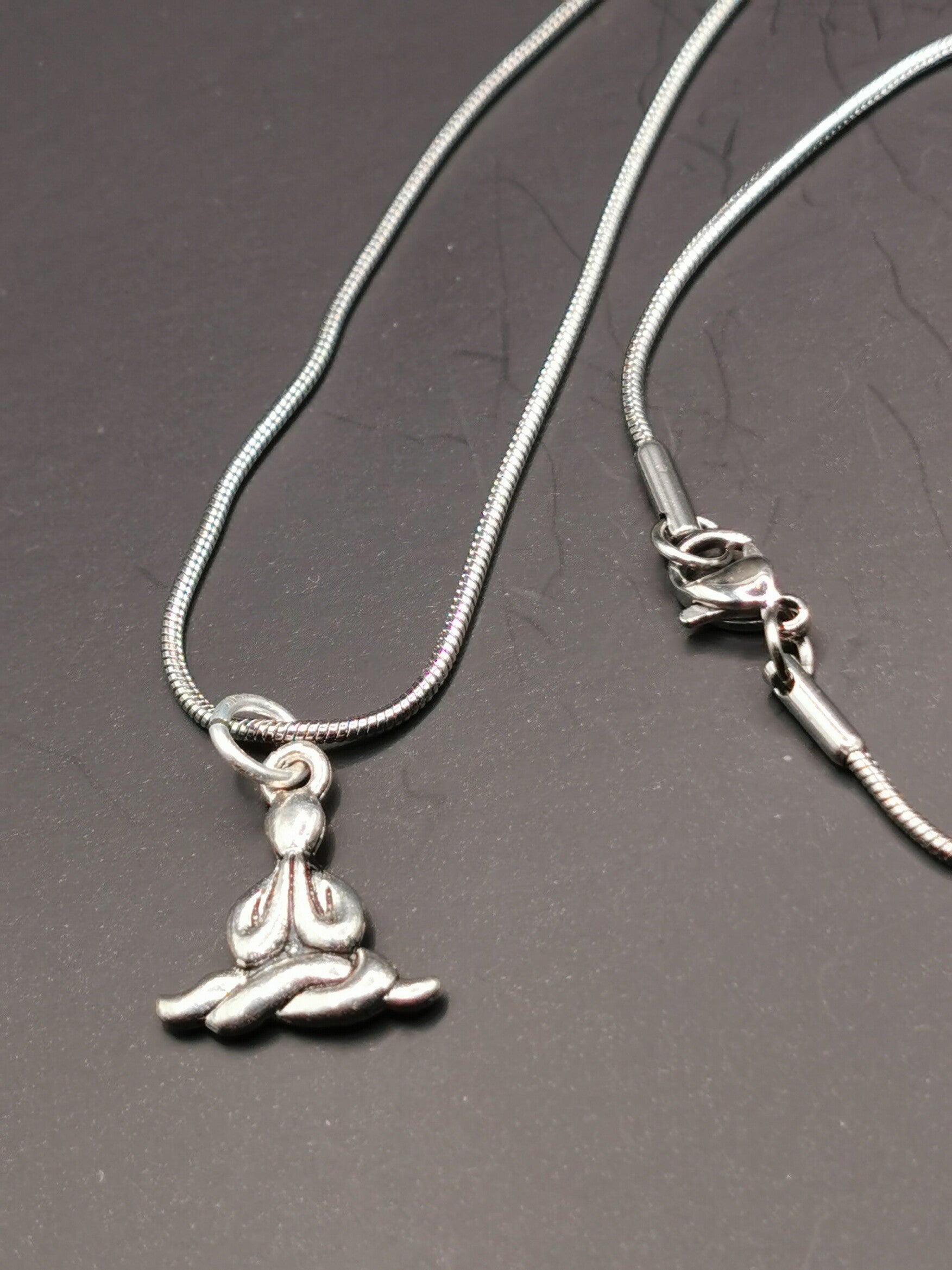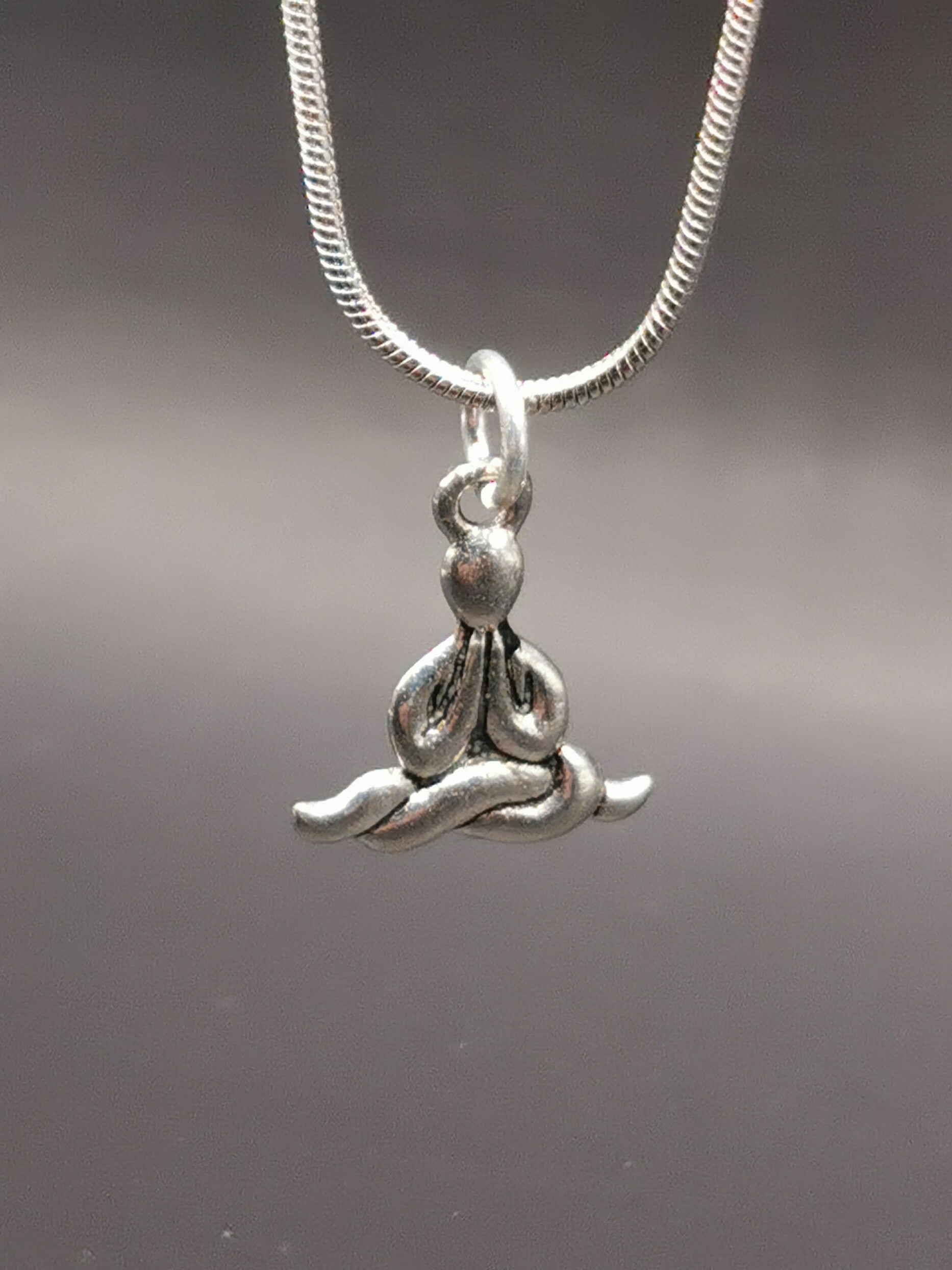 Mooie verzilverde 3D-hanger van een gestileerd figuurtje in de Lotushouding, de welbekende meditatiehouding van yoga-beoefenaars. Om helemaal Zen van te worden!