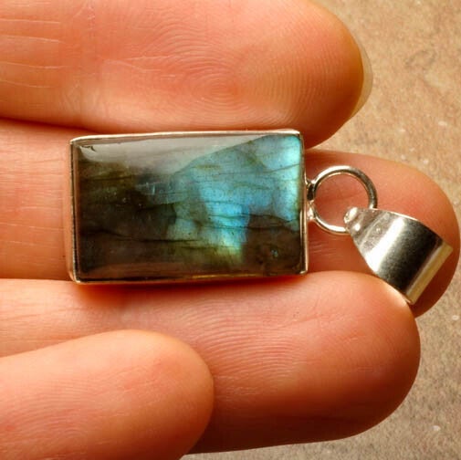Handgemaakte, rechthoekige hanger met Labradoriet. De steen heeft een mooie diepe gloed van blauw- en goudtinten. Solide afgewerkt met een brede verzilverde rand. De hanger is aan de achterzijde open.