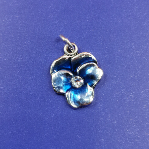 Bijzonder hangertje met een kleine Swarovski kristal in het hart. Dit mooie, verfijnde viooltje heeft blauw geëmailleerde bloemblaadjes. Deze hebben een zijdeachtige glans en tinten die in elkaar overlopen. Handgemaakt in de VS.