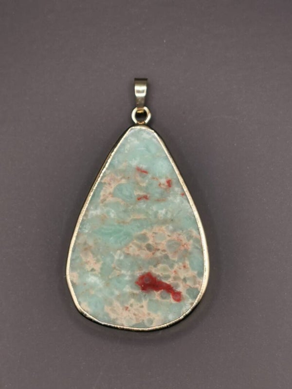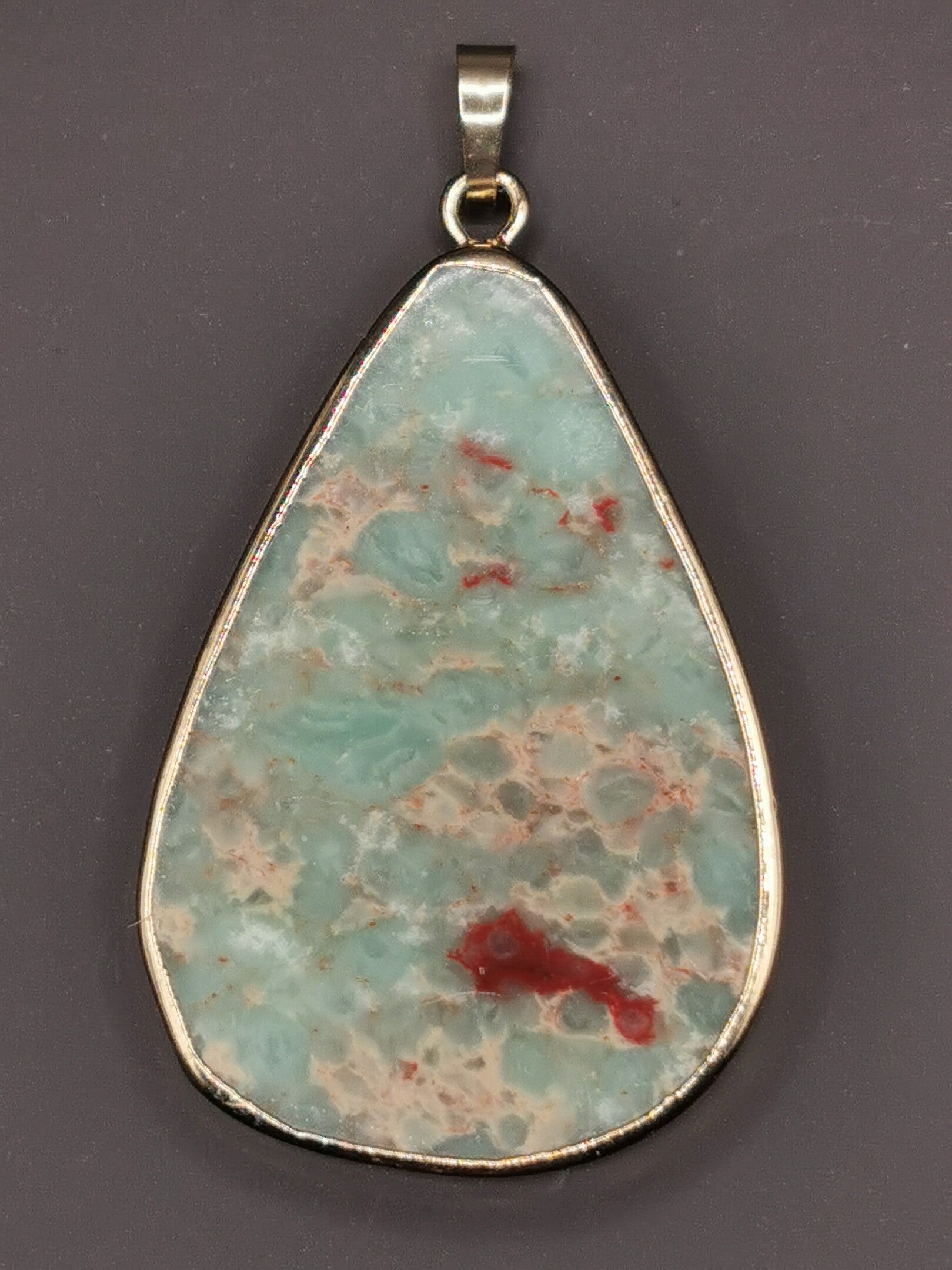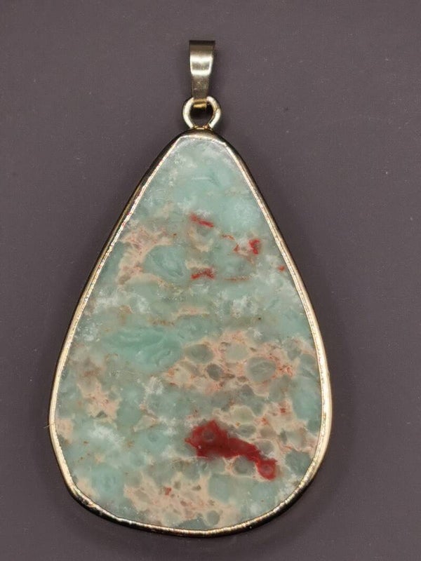 Opvallende hanger met een druppelvormige Jaspis in een zachte blauwgroene tint. De rand is goud verguld. De hanger is aan de achterzijde open.