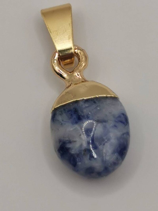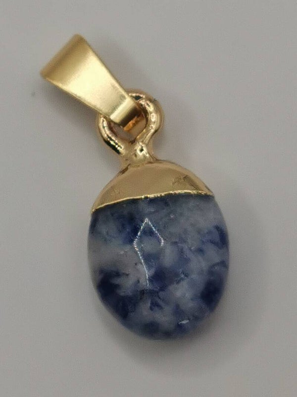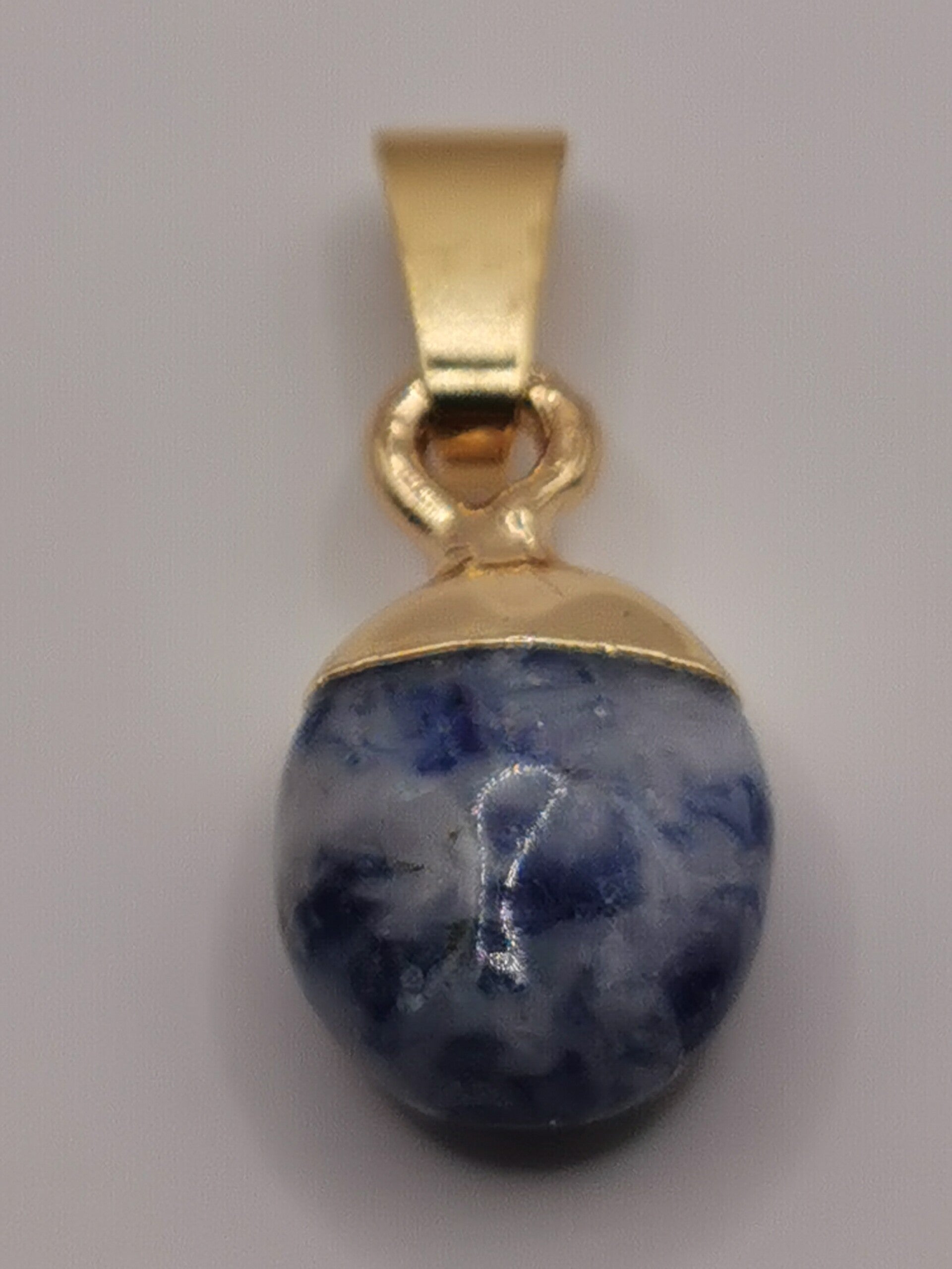 Ovaal hangertje met een facet geslepen Sodaliet. Het steentje heeft een bolle vorm en is glanzend gepolijst. De metalen delen zijn gold plated.