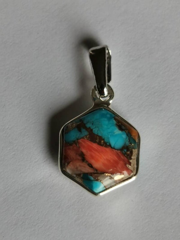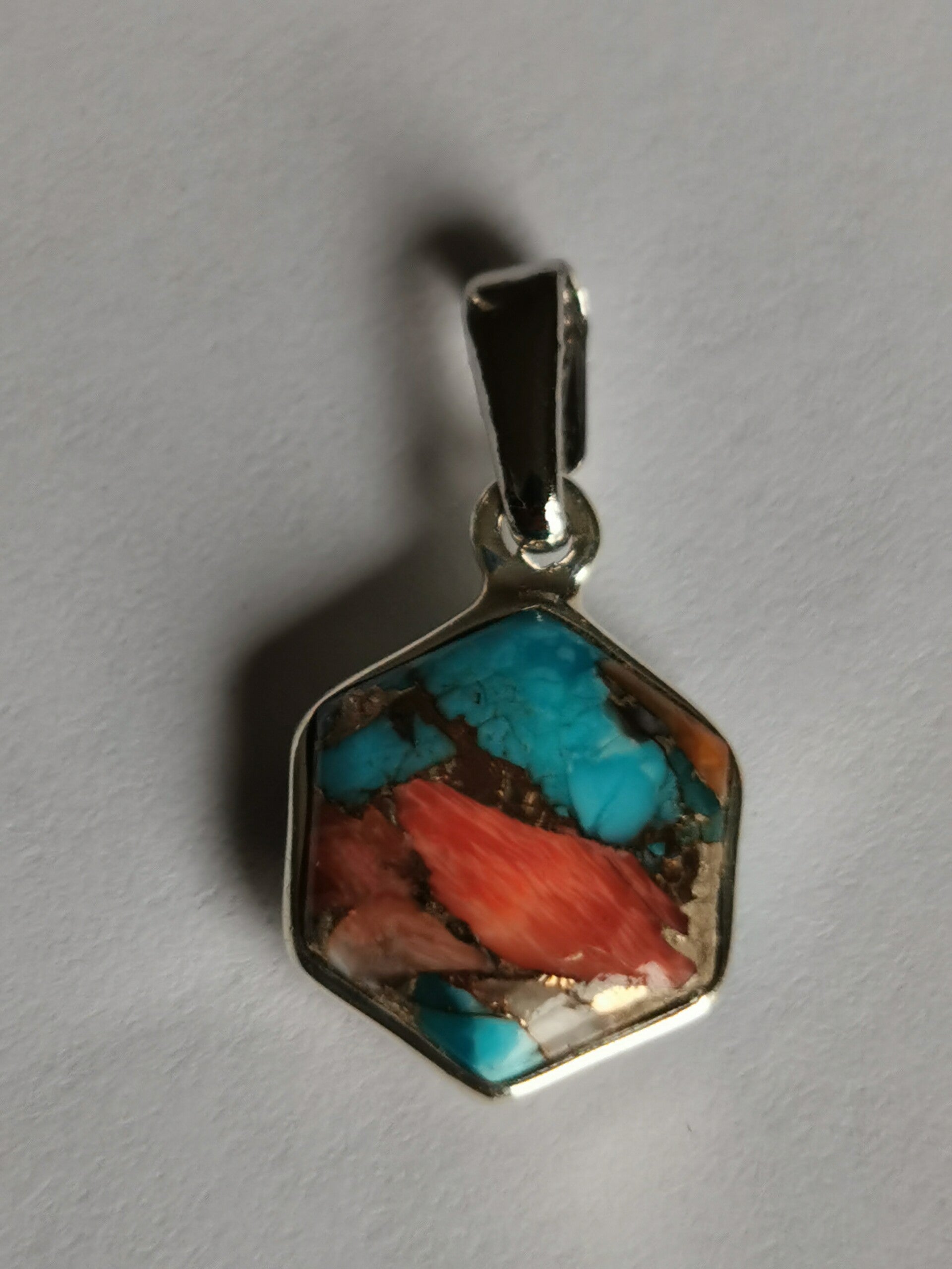 Zeshoekig hangertje met Spiny Oyster, Turquoise en Koper. Deze stenen bevatten een combinatie van schelp en steen. De schelpen hebben fantastische kleuren zoals wit, geel, oker, roze, rood, zachtbruin en paars en dit wordt nog extra versterkt door het felblauw van turquoise en het goudkleurige koper.