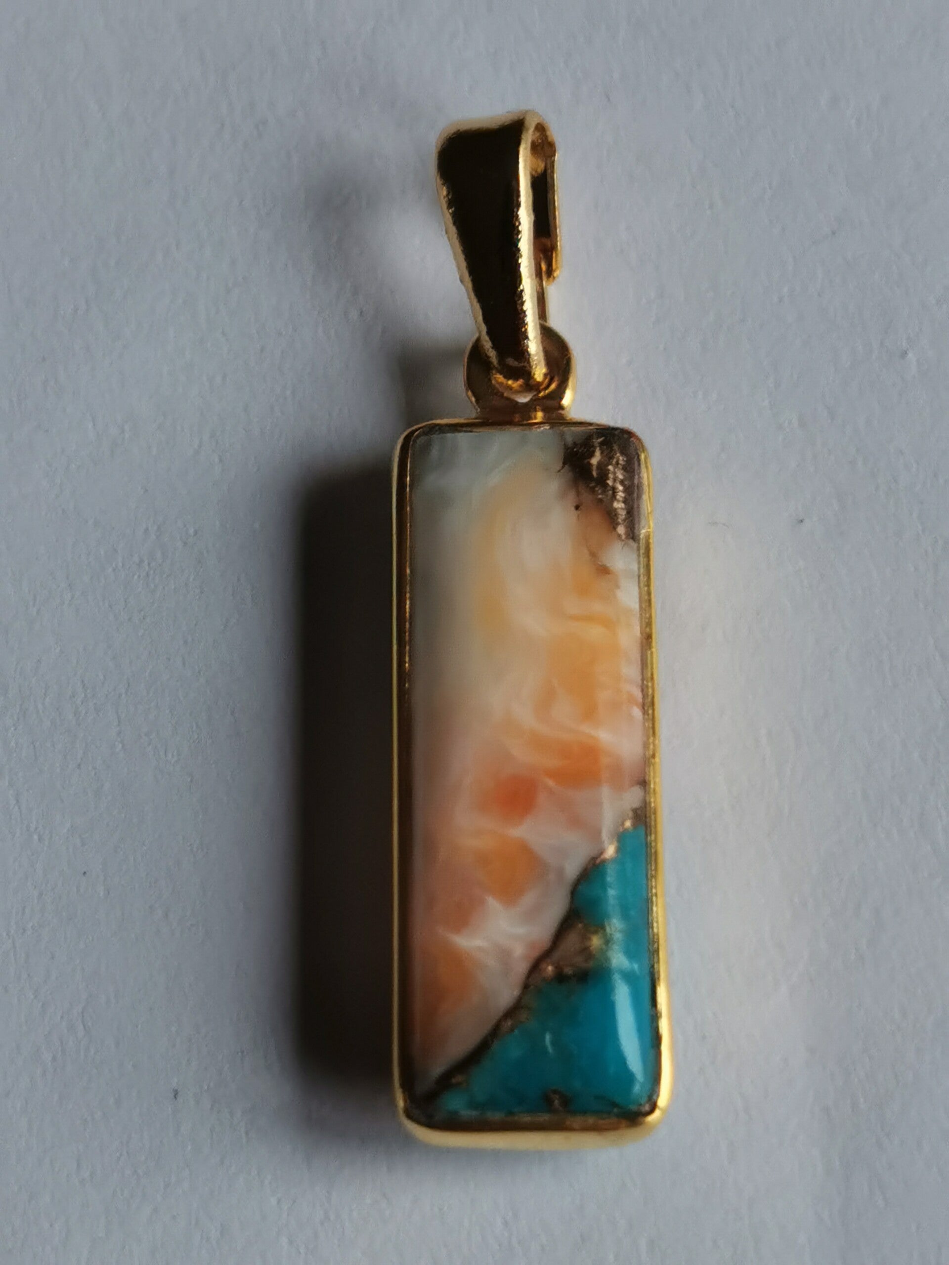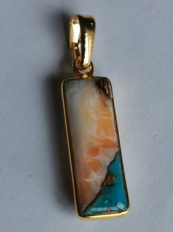 Langwerpig hangertje met Spiny Oyster, Turquoise en Koper. Deze stenen bevatten een combinatie van schelp en steen. De schelpen hebben fantastische kleuren zoals wit, geel, oker, roze, rood, zachtbruin en paars en dit wordt nog extra versterkt door het felblauw van turquoise en het goudkleurige koper.